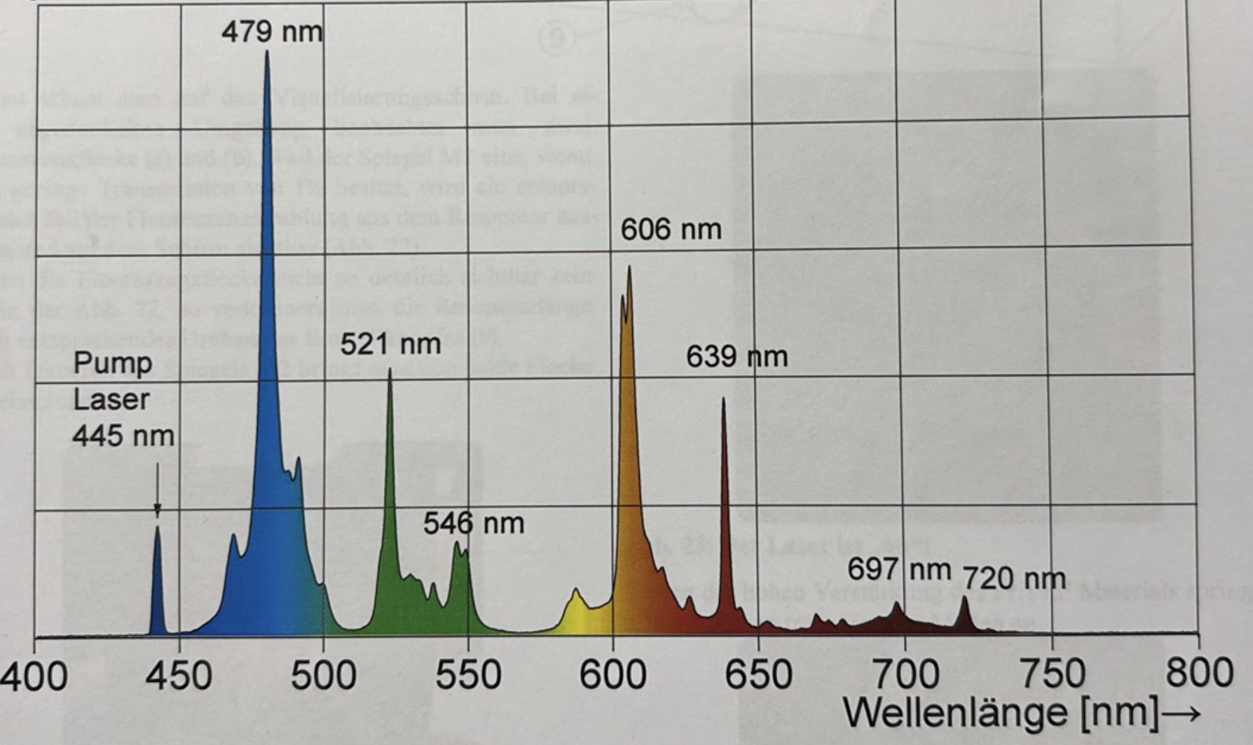 Kann ein Laser mehrere Farben haben? — Typischerweise hat ein Laser genau eine Farbe, ist also eine monochromatische Lichtquelle. Das liegt daran, dass genau ein Übergang zwischen den Energieniveaus am häufigsten stattfindet. Aber was passiert, wenn dieser Übergang unterdrückt wird? Ein anderer Übergang wird sichtbar und der Laser wechselt die Farbe! Durch das Tauschen spezieller Spiegel kannst du das hier selbst ausprobieren.